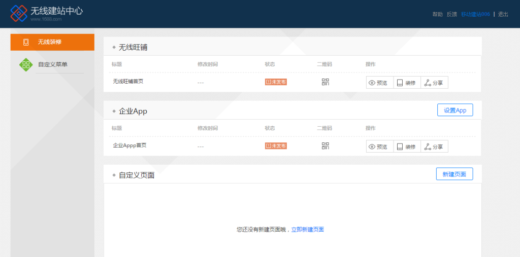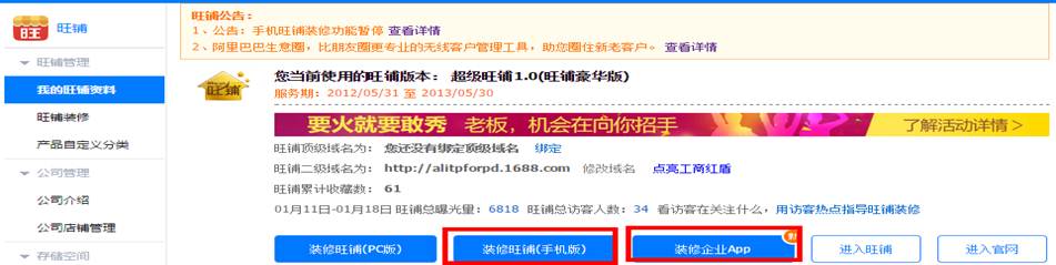您可以在“我的阿里”中找到并進入“旺鋪”,在我的旺鋪資料頁面點擊“裝修旺鋪(手機版)”、“裝修企業(yè)APP”按鈕后,會進入無線建站中心,您可以在該頁面統(tǒng)一設(shè)置無線旺鋪和企業(yè)app,如下圖: