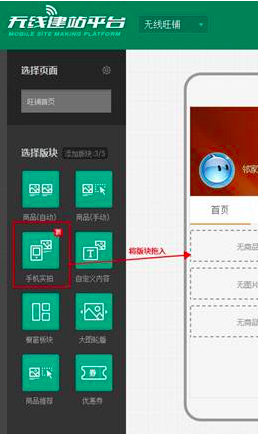 點擊左側(cè)板塊選擇,向頁面預(yù)覽區(qū)拖拽,將板塊拖至框中,松開鼠標(biāo),即插入板塊,板塊在頁面預(yù)覽區(qū)上下拖拽,預(yù)覽頁面跟隨滾動。