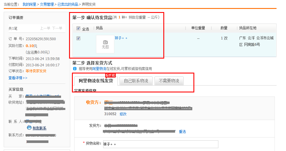 2、按照頁面提示,確認發貨的貨品,并選擇發貨方式,填寫相關的發貨內容進行提交即可。